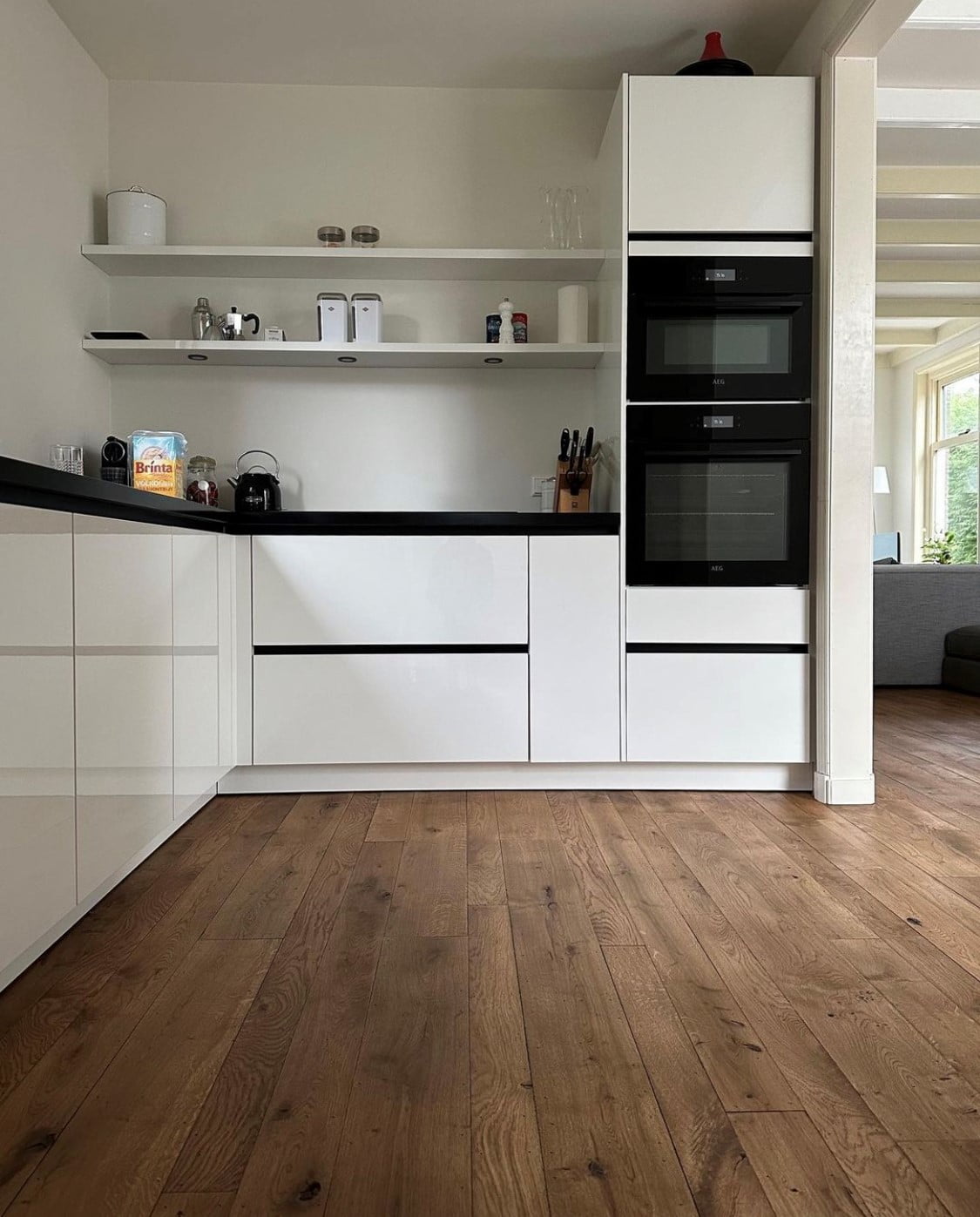 – Deze vloer wordt direct verlijmd op een vlakke ondervloer, hiermee wordt de totale dikte ca. 15-16 mm.